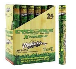 Cyclones Hemp Cones use an innovative pre-rolled cone shape which is designed for easy filling as well as giving our customers a great tasting product where your last puff is as good as your first. These Wonderberry flavored cones use a unique hemp material that gives users a clean smoking experience and also feature a "Dank7" wooden tip that keeps the cones clean and easy to smoke. The Cyclones Hemp Cones come in a 24 tube display case that features one, 109mm, cones per tube. These tubes use a secure screw top lid that keeps the cones fresh for long as possible and ensure that your cones will not come out of the tube in your pocket! Delivered, Inc is a cannabis dispensary near Worcester, MA with a twist- we deliver to your home! Shop cannabis home delivery throughout Central Massachusetts with Delivered, Inc today!