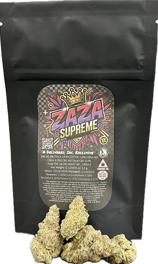A Delivered, Inc Exclusive π Experience the pinnacle of relaxation with Zaza Supreme, a premium indica-dominant hybrid that blends potent, body-melting effects with a rich, flavorful profile. A true connoisseur's strain, Zaza Supreme delivers a smooth, earthy aroma with hints of sweet citrus and spicy pine, followed by a creamy, herbal taste on the exhale. The high hits quickly, offering a wave of euphoria that melts away stress and tension, perfect for unwinding after a long day. Expect deep relaxation, soothing body effects, and a tranquil, sedative finish. Ideal for evening use or anytime you need a moment of pure bliss. Delivered, Inc is a cannabis dispensary near Worcester, MA with a twist- we deliver to your home! Shop cannabis home delivery throughout Central Massachusetts with Delivered, Inc today. TAC: 25.2%; THCA: 19.9%; CBGA: 4.3%; Total Terps: 1.55%;