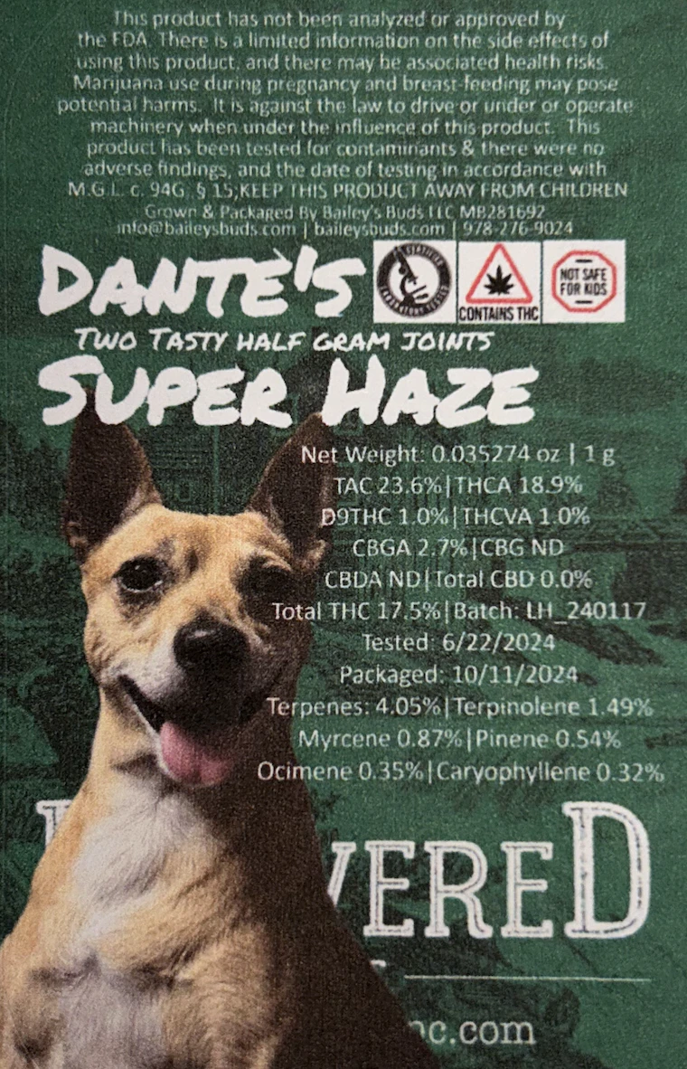**Buy 1 for $11 or 4 for $40 w/taxes! Mix n Match all $11 Prerolls** Fall into bliss with Dante's Super Haze, an exclusive strain brought to you by Delivered, Inc. Grown Indoor, in 100% Organic, No-Till Living Soil. This uplifting strain is perfect to start your day or when you need that second wind during those long days. 1g total. Delivered, Inc is a cannabis dispensary near Worcester, MA with a twist- we deliver to your home! Shop cannabis home delivery throughout Central Massachusetts with Delivered, Inc today! TAC: 23.6% Total Terps: 4.05% **NOT ELIGIBLE FOR DISCOUNTS**