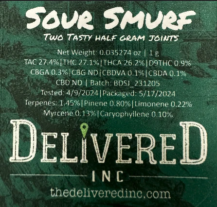 **Buy 1 for $11 or 4 for $40 w/taxes! Mix n Match all $11 Prerolls** Back by popular demand, Delivered's exclusive 2024 strain: Sour Smurf. a sweet, cheesy aroma and a similar flavor that's smooth and light. The high is more relaxed than might be expected, yet still functional enough to get through the day with no worries. Sour Smurf is a cross between Jack Herer x Sour Diesel. Enjoy it while it last, this is a VERY limited drop. Once its gone, its gone. Delivered, Inc is a cannabis dispensary near Worcester, MA with a twist- we deliver to your home! Shop cannabis home delivery throughout Central Massachusetts with Delivered, Inc today! TAC: 25.7% Total Terps: 4.30% **NOT ELIGIBLE FOR DISCOUNTS**