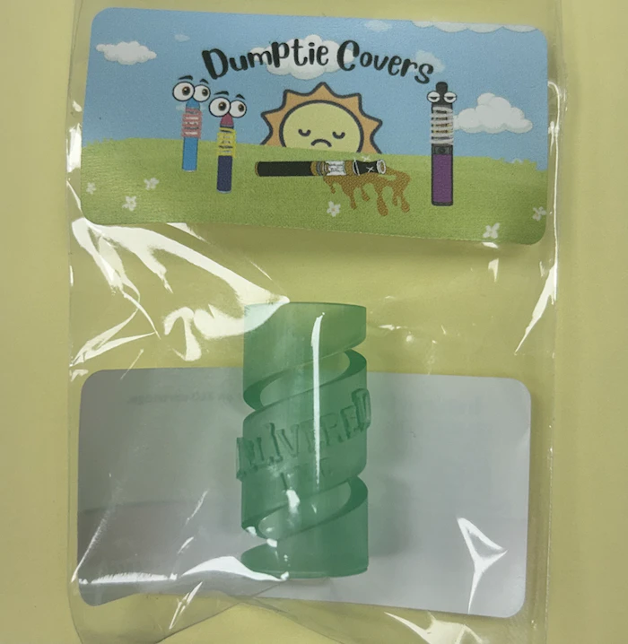 Exclusive Delivered Dumptie Covers. Only available through Delivered, Inc! Dumptie Covers are the newest accessory for 510 cartridges! Push and twist onto 510 cartridges to protect the vape cart from hard surfaces. Fits standard 510 THC and CBD vape cartridges ranging from 0.3g to 1g. Vape pen and cartridge not included.