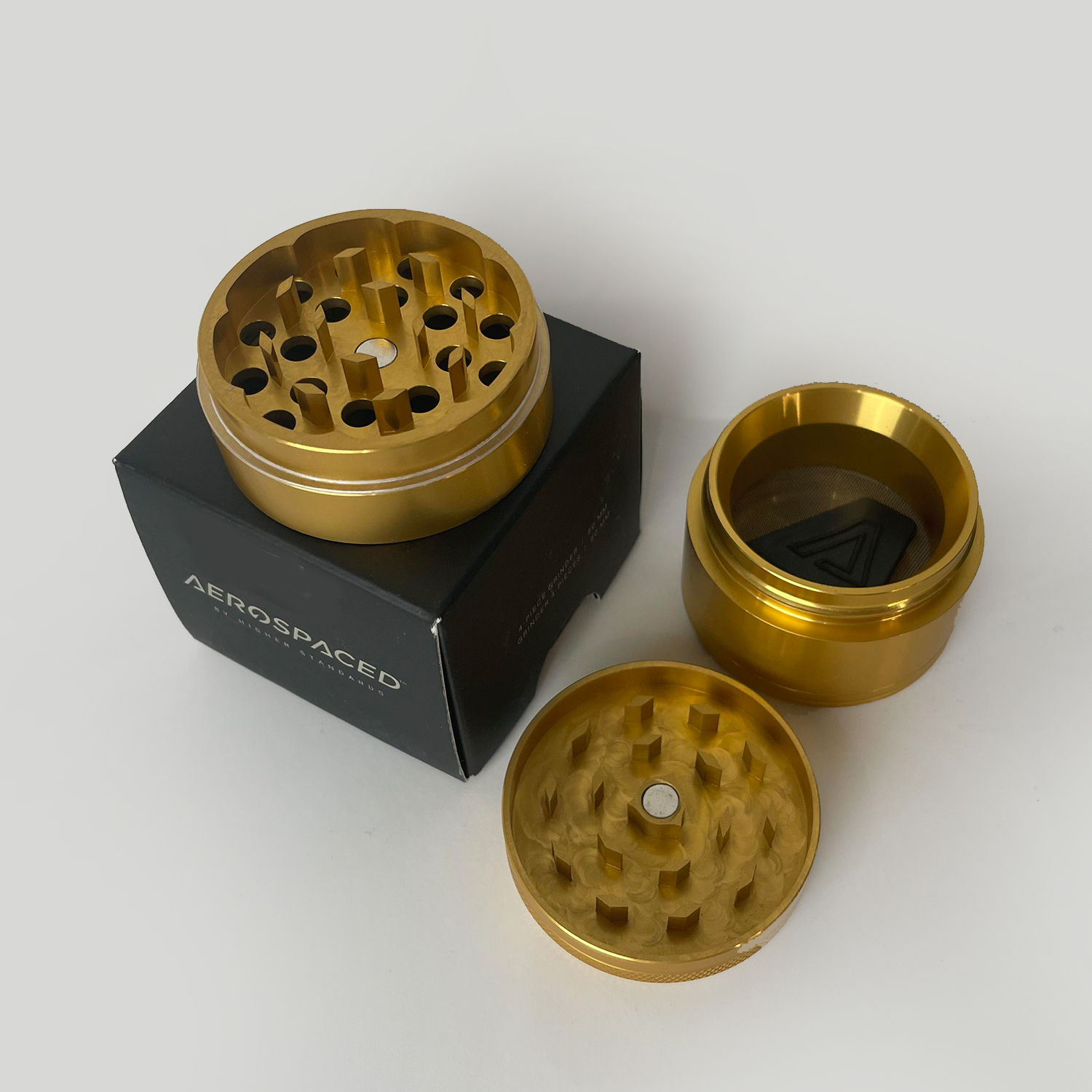 Aerospaced by Higher Standards, Classic gold the luxe smoking authority, sets the standard in grinder quality. These grinders feature aircraft-grade aluminum and sharp, diamond-shaped teeth that finely shred material to an even consistency—preparing you for an unmatched smoking experience