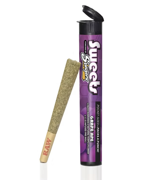 Rich grape flavor and mellow body effects define this timeless classic. Grape Ape fuses full flower with Liquid Diamonds and Natural Terpenes for a smooth, flavorful burn that melts away the day.Grape Ape is a classic indica known for its deep purple hues and bold, grape-candy aroma. The smoke is thick and fruity with notes of berry syrup, earthy kush, and a hint of spice. Effects settle in slowly with a soothing body melt and a hazy, tranquil headspace that quiets the noise without knocking you out. Perfect for unwinding in the evening, sinking into music, or smoothing out the edges of a long day